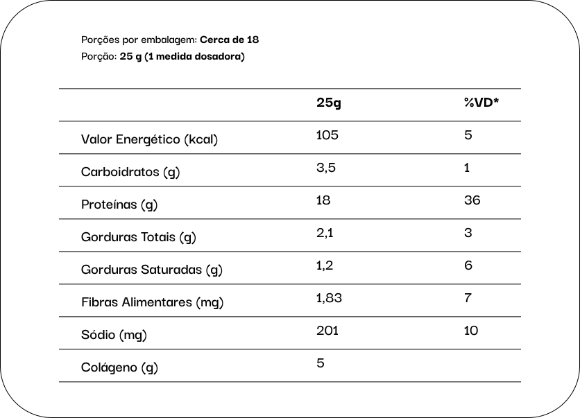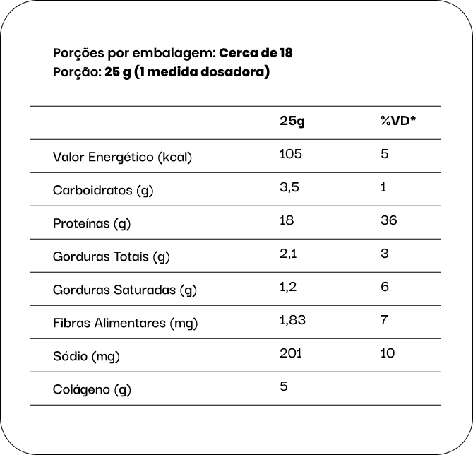 Proteína isolada de ervilha, colágeno hidrolisado, leite de coco em pó, proteína isolada de arroz, cacau em pó, antiumectantes fosfato tricálcico e dióxido de silício, espessantes goma guar e goma xantana, edulcorantes naturais eritritol e glicosídeos de steviol (stévia), aroma idêntico ao natural de chocolate branco. NÃO CONTÉM GLÚTEN, NÃO CONTÉM LACTOSE